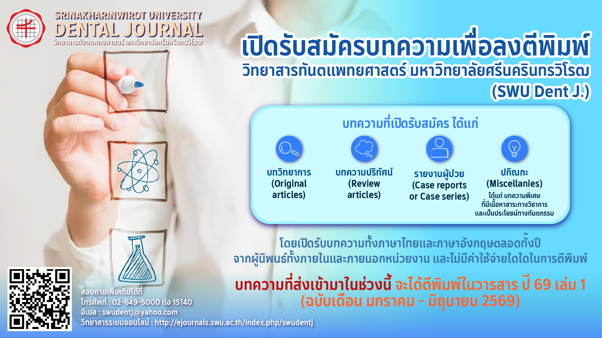 เปิดรับสมัครบทความเพื่อลงตีพิมพ์วิทยาสารทันตแพทยศาสตร์ มหาวิทยาลัยศรึนครินทรวิโรฒ(SWU Dent J.)