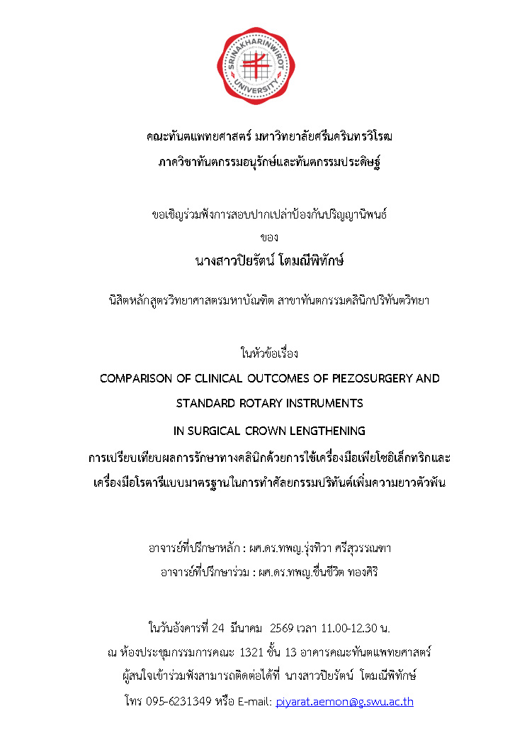 ขอเชิญร่วมฟังการสอบปากเปล่าป้องกันปริญญานิพนธ์ ของนิสิตหลักสูตรวิทยาศาสตรมหาบัณฑิต สาขาทันตกรรมคลินิก (ปริทันตวิทยา)