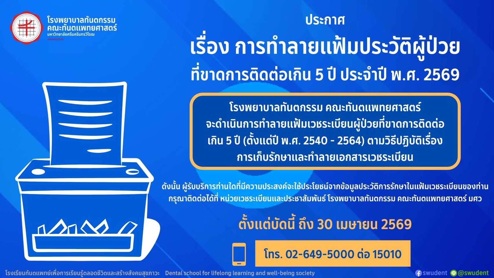 ประกาศการทำลายแฟ้มประวัติผู้ป่วยที่ขาดการติดต่อเกิน 5 ปี ประจำปี พ.ศ. 2569