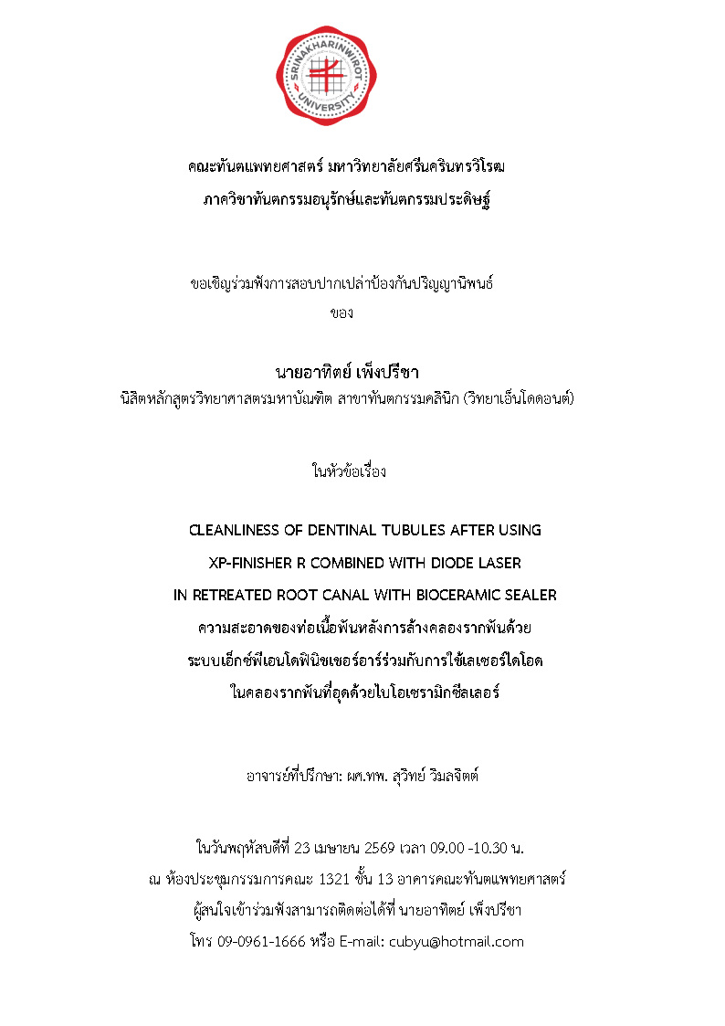 ขอเชิญร่วมฟังการสอบปากเปล่าป้องกันปริญญานิพนธ์ ของนิสิตหลักสูตรวิทยาศาสตรมหาบัณฑิต สาขาทันตกรรมคลินิก (วิทยาเอ็นโดดอนต์)
