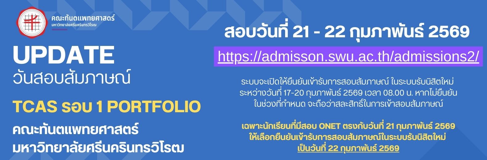 กำหนดการสอบสัมภาษณ์ TCAS รอบ 1 (Portfolio) คณะทันตแพทยศาสตร์ มหาวิทยาลัยศรีนครินทรวิโรฒ 9 กุมภาพันธ์ 2569